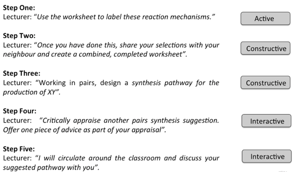 Figure 1: An example of a modelled hierarchical teaching philosophy to progressively promote a learning event from an active approach, through constructive, to an interactive approach. This modelled example is based on a typical first year foundation organic chemistry topic; organic reaction mechanisms and synthesis.