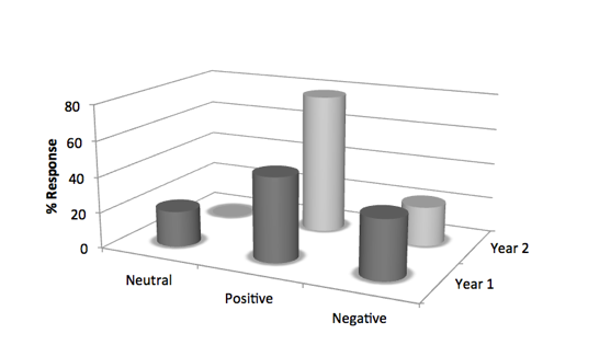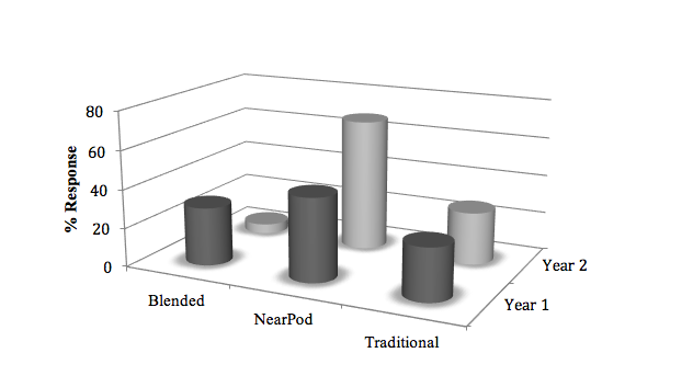 The majority of questionnaire participants, from both cohorts, suggested that a NearPod enabled class was the most interactive class in comparison to a traditional (non-technology enhanced) class or a blended (mix of traditional and technology enhanced) class, see Figure 2. A difference between the two cohorts is noted in the decrease between Years 1 and 2 who perceived a blended learning model to be the most interactive. Interestingly, the Year 2 cohort also indicated a stronger perceived positive impact of a NearPod enabled class (78%, n=32; compared with the Year One cohort 47%, n=14; see Figure Three). This data suggests that the Year 2 cohort felt a stronger perceived benefit from the NearPod class; however, additional factors, such as the cohort type (Year Two cohort were Level 8 students only), content of the curriculum (Year Two curriculum was a traditionally popular Introductory Biochemistry module) and the personal development of the student in terms of maturity and awareness of their role in learning should also be considered. The flipped classroom approach was adopted in the NearPod classes that underpinned this research, and was supported by the pervasive use of technology. This aligned to Strayer’s (p.172, 2012) position that “regular and systematic use of interactive technology” enables technology enabled flipped classes to empower students to deeper levels of understanding and knowledge development, more so than more traditional, non-technology enhanced classes. Although the Year One students in this study had experienced traditional flipped classes; they may not have yet developed the maturity and skill set to become independent learners in comparison to the more experience Year Two cohort, resulting in a differing perceived impact on learning. This echoes previous research, which outlines how early year undergraduate students can initially struggle with flipped classroom learning, but with experience develop the skills set and maturity required to learn effectively under that teaching paradigm (Mason, Shuman, & Cook, 2013). Additionally, perhaps the Year One cohorts’ larger perceived benefit of a blended approach (30%, n= 9; versus 5%, n=2 for Yr2; see Figure Two) reflects the transitional nature of the first year group recently exposed to technology enhanced learning.